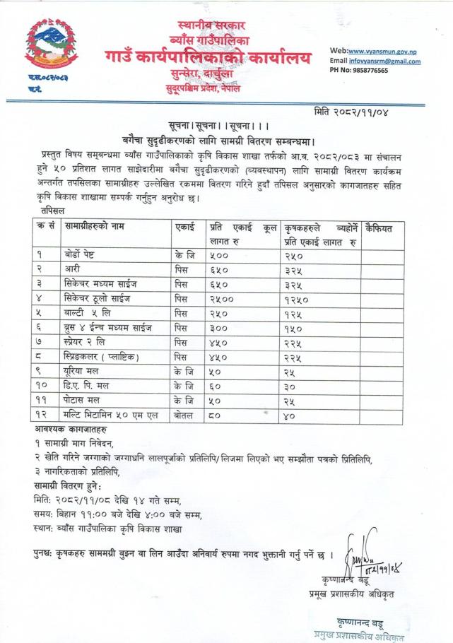५० प्रतिशत अनुदानमा कृषि उपकरण वितरण सम्बन्धी सुचना ।